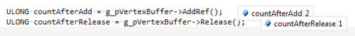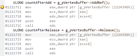 Let’s construct a helper macro to get the current reference count of our vertex buffer. This is mostly for debug purposes as the reference counter is very likely atomic (as noted by the “lock xadd” instruction which is an atomic exchange and add).