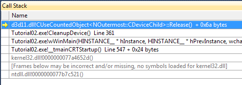 And you can see the callstack, in Tutorial02 from the DirectX samples, I hit the breakpoint during CleanupDevice which calls Release.