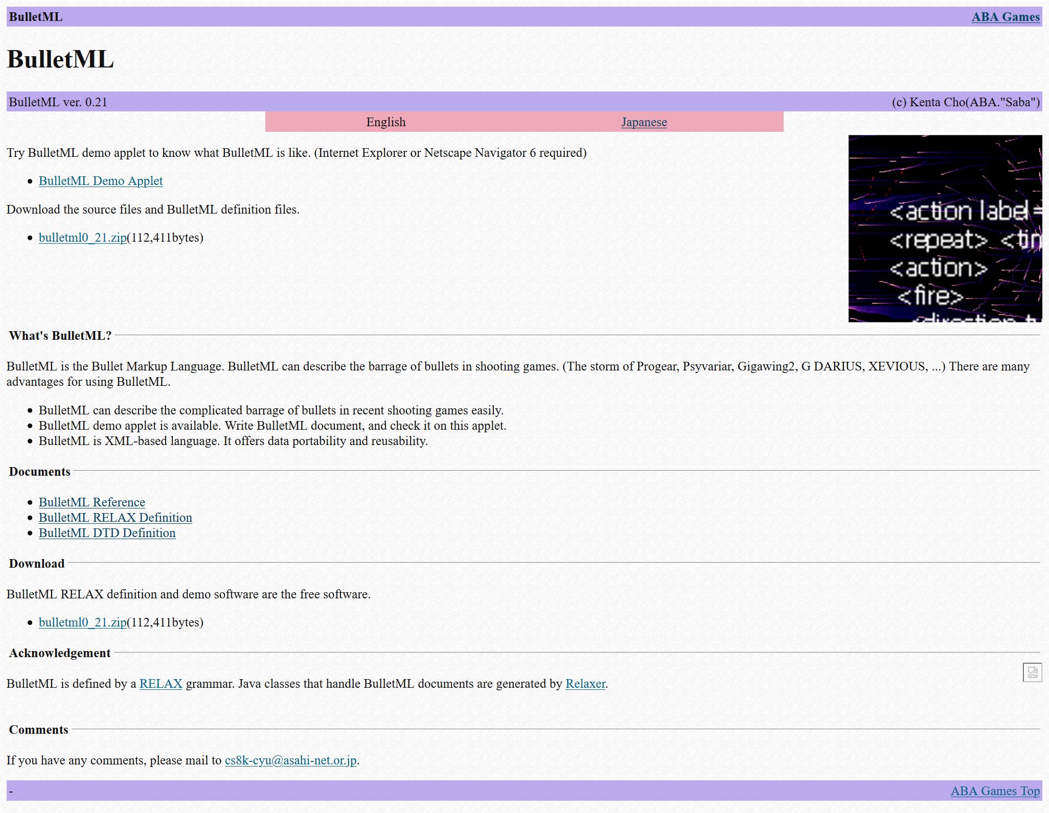 BulletML is a code library used by Kenta Cho, the original developer of the project. It’s used in a lot of his projects and handles the behaviour of bullets. It’s based on XML and is written in C++ and compiled to .dll/.lib for linking into the final executable.